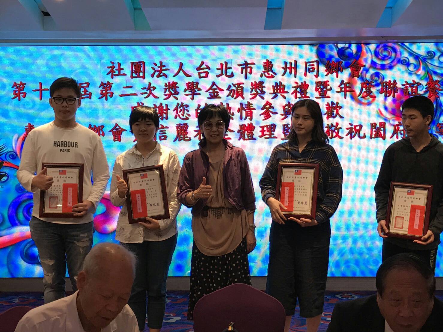本年度惠州同鄉會在頒發獎學金部分,共有五位同學受獎:碩士1人新豐籍的潘才鉉、大學生1人龍川籍的鄒景昊、高中生2人汕尾籍的蒲思云和海豐籍的鄭 質、國中生1人博羅籍的黃楷鈞。分別由獎學金委員會何其忠主委、常務理事陳有用、蔡傑智、潘英穗及鄒培強顧問等人頒發獎學金給受獎同學。