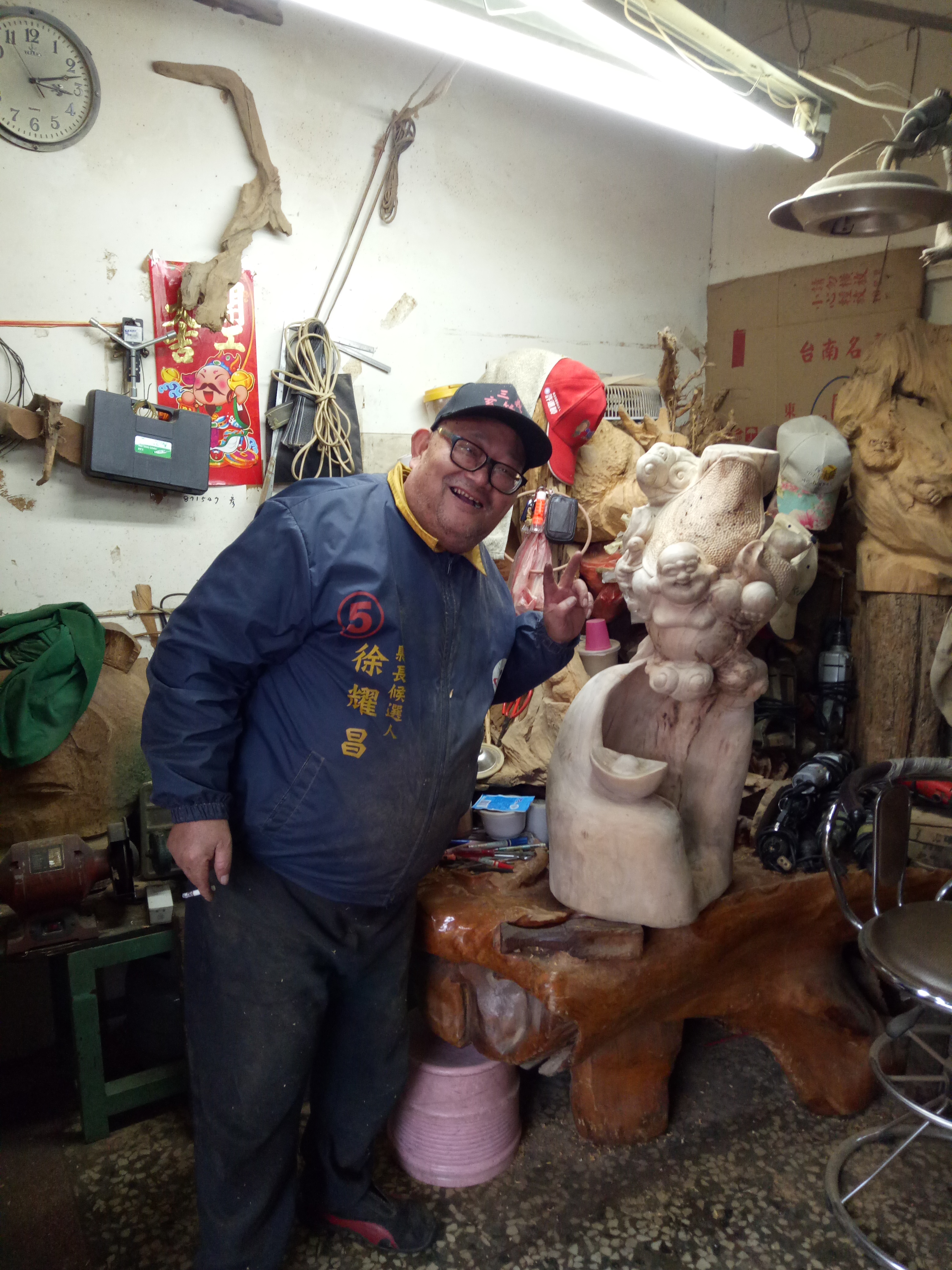 因為身障者在某方面身體的缺陷,可能比許多人缺少機會,甚至是要很努力的在這社會尋找生存方式,在更早以前的時期,或許有色眼光以及歧視比現在更為濃厚,而謝瑞雄先生正是因為那正直又不屈不撓的個性,為自己的生命尋找到一條出路。他的工作室位於三義,從外頭看上去,門口堆疊了許多的木頭、木材,沿著入口的階梯走上去,撲鼻而來的是樟木的香氣,緊接著映入眼簾的是他擺滿工作室的木雕,彷彿宮崎駿動畫電影中那部移動的城堡似的,外面凌亂裡頭卻大有看頭,各式各樣的彌勒佛、達摩、鍾馗、動物、還有他憑自己意象創造出來的作品。