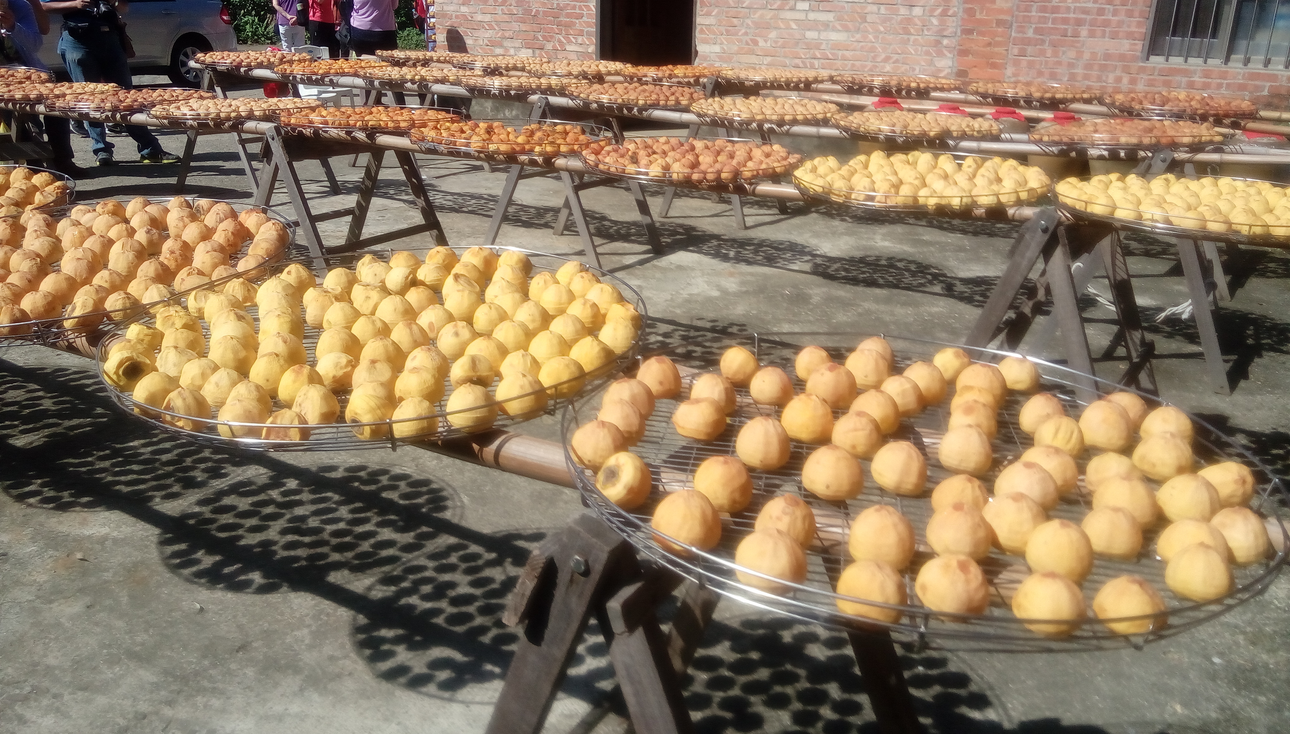 柿餅是一種天然加工品,它的質地Q軟,風味特殊!從柿子肥胖外形變成瘦扁的柿餅,過程就像是減肥一樣,必須經過幾道加工手續。首先,削皮、去蒂是作柿餅的第一步。日曬前,它先要經過龍眼木的燒烤烘熟,這麼做的目的在增加柿餅的風味,另外碳烤煙味也有助於曝曬過程中蚊蠅的干擾。經過原木薰陶後的柿餅,緊接著會組成龐大的「黃金隊形」開始作日光浴,這時九降風的吹拂是催熟的關鍵;日曬第二天,柿子需要翻身,設計這一步驟的原因在預防底部受熱不均而壞掉;第三天則要幫柿子做全身按摩,這個步驟很重要,因為一塊柿餅的好壞成敗就在此一舉。