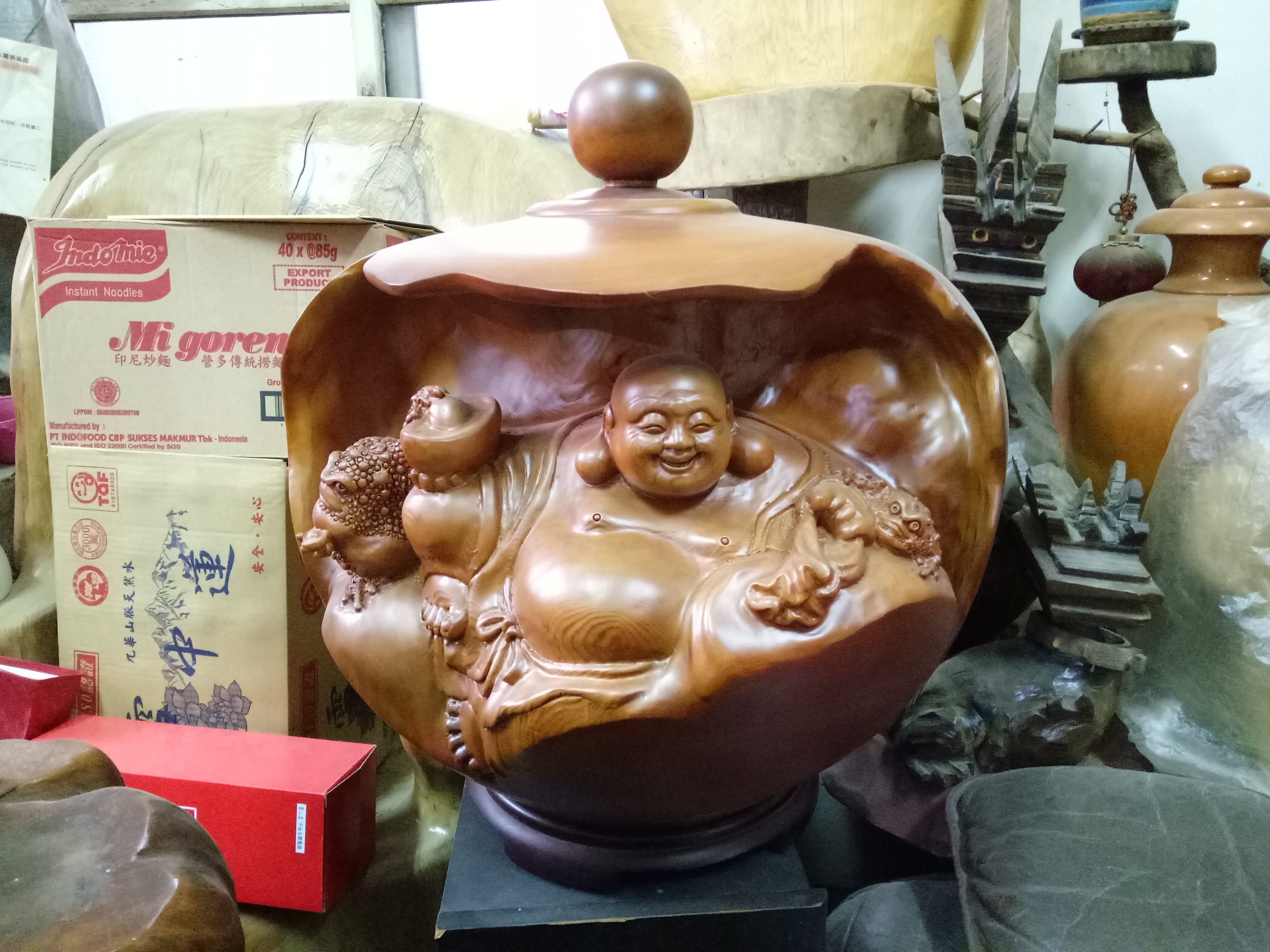 拿起雕刻工具的謝瑞雄先生,在聚焦的燈下開始了他仍在琢磨的彌勒佛,那畫面真要形容,彷彿是彌勒摩在刻彌勒佛自己!有著圓滾滾身材的他,臉上總是掛著大大的笑容,眼神中的慈愛讓人動容,或許因為身材圓潤使得他走起路有些緩慢,但那寧靜的心與強大力量的雙手,就像是在舞台上表演的舞者般,他在自己的工作室翩翩起舞,說他是人間的彌勒佛也不為過。