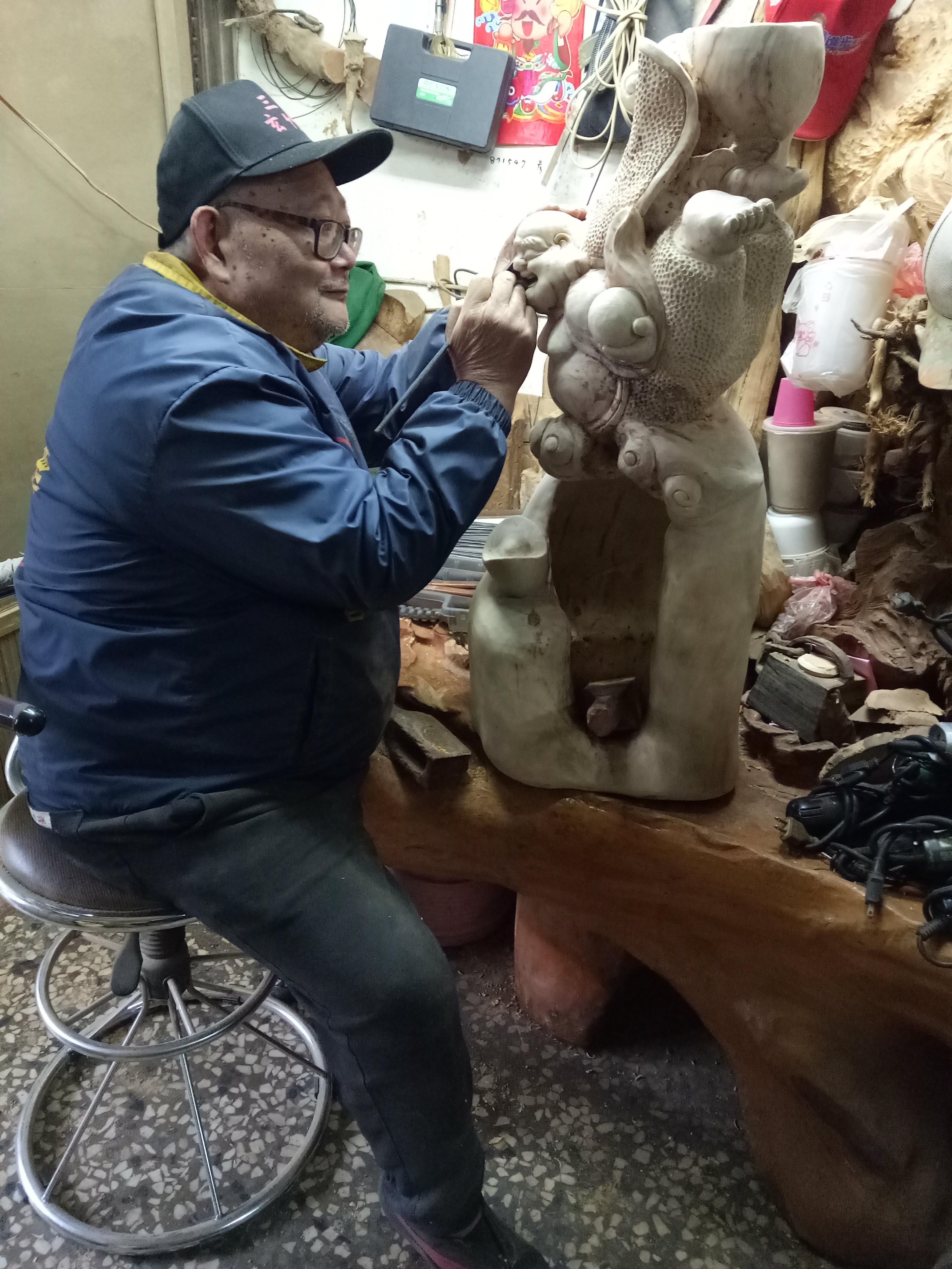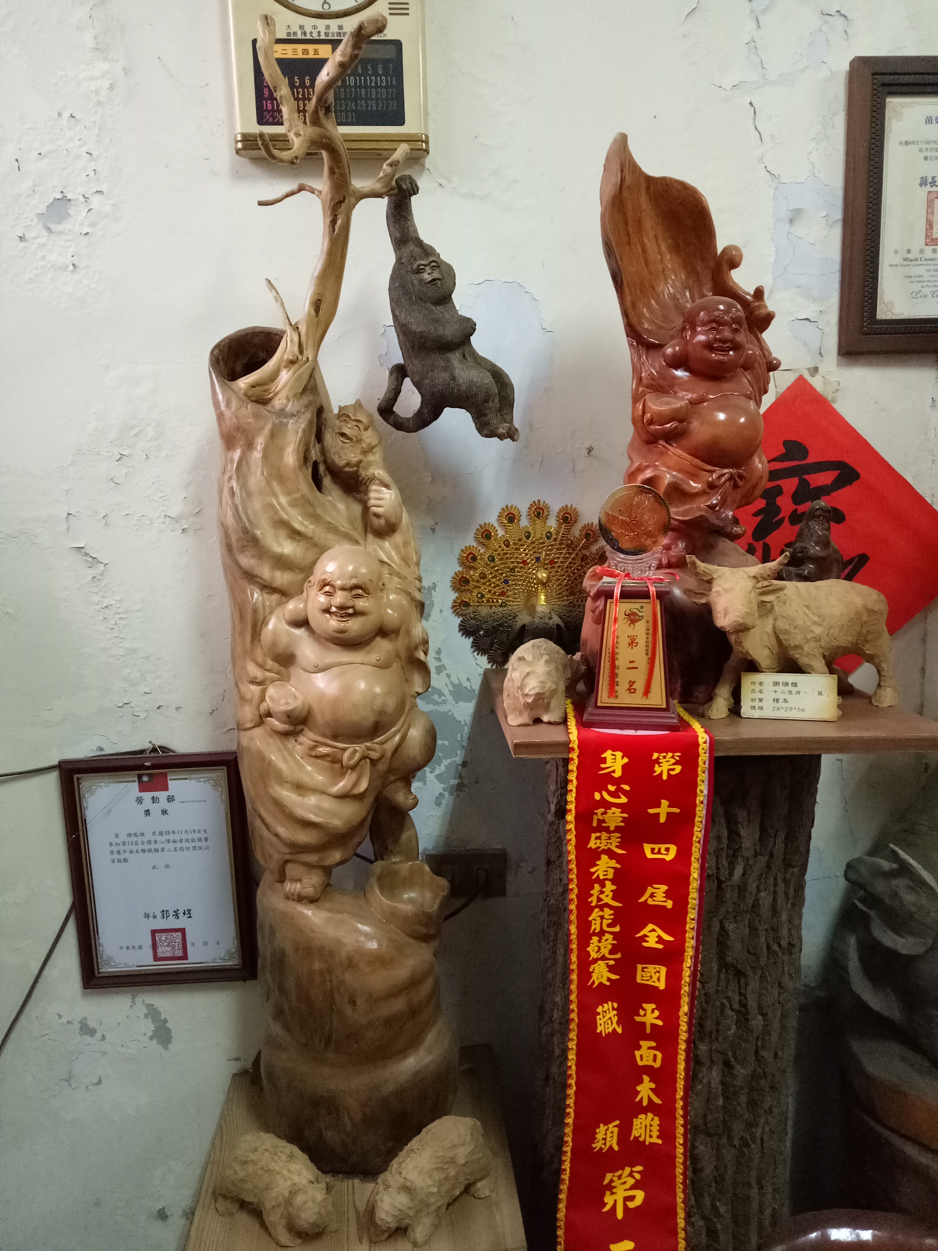 因為身障者在某方面身體的缺陷,可能比許多人缺少機會,甚至是要很努力的在這社會尋找生存方式,在更早以前的時期,或許有色眼光以及歧視比現在更為濃厚,而謝瑞雄先生正是因為那正直又不屈不撓的個性,為自己的生命尋找到一條出路。他的工作室位於三義,從外頭看上去,門口堆疊了許多的木頭、木材,沿著入口的階梯走上去,撲鼻而來的是樟木的香氣,緊接著映入眼簾的是他擺滿工作室的木雕,彷彿宮崎駿動畫電影中那部移動的城堡似的,外面凌亂裡頭卻大有看頭,各式各樣的彌勒佛、達摩、鍾馗、動物、還有他憑自己意象創造出來的作品。
