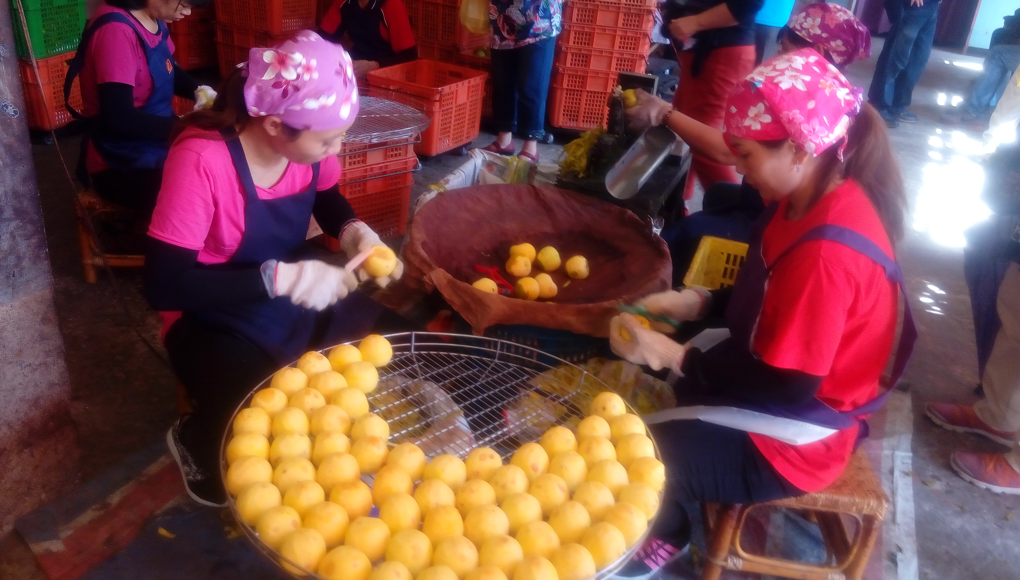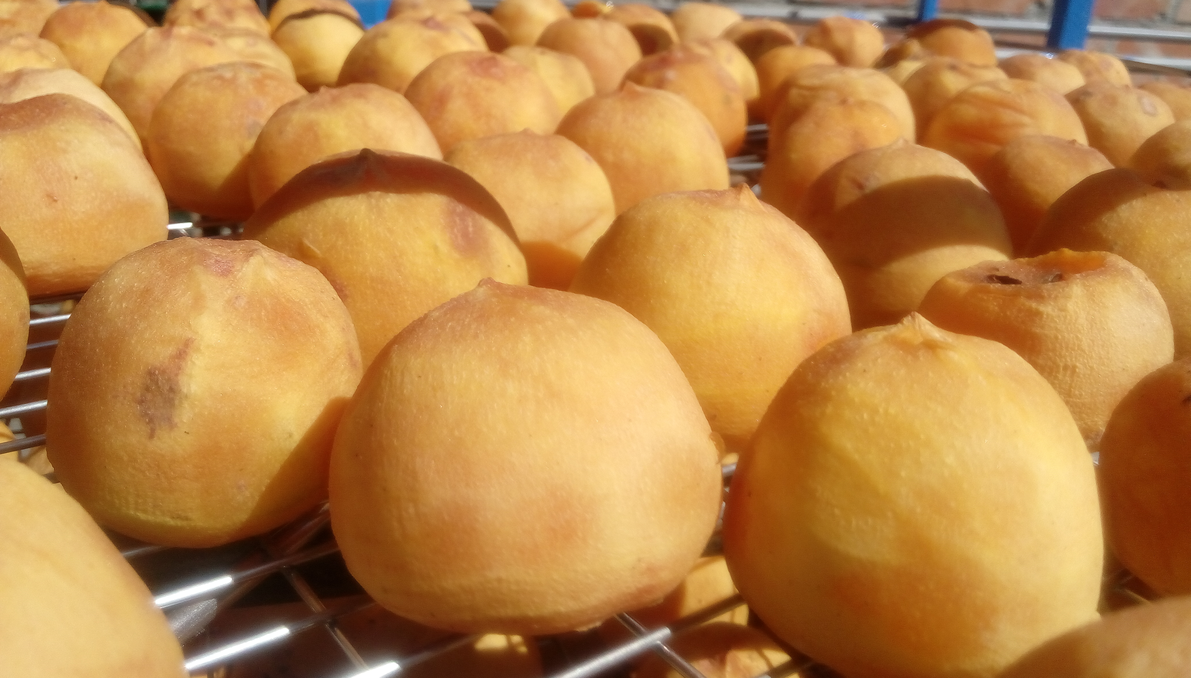 柿餅是一種天然加工品,它的質地Q軟,風味特殊!從柿子肥胖外形變成瘦扁的柿餅,過程就像是減肥一樣,必須經過幾道加工手續。首先,削皮、去蒂是作柿餅的第一步。日曬前,它先要經過龍眼木的燒烤烘熟,這麼做的目的在增加柿餅的風味,另外碳烤煙味也有助於曝曬過程中蚊蠅的干擾。經過原木薰陶後的柿餅,緊接著會組成龐大的「黃金隊形」開始作日光浴,這時九降風的吹拂是催熟的關鍵;日曬第二天,柿子需要翻身,設計這一步驟的原因在預防底部受熱不均而壞掉;第三天則要幫柿子做全身按摩,這個步驟很重要,因為一塊柿餅的好壞成敗就在此一舉。